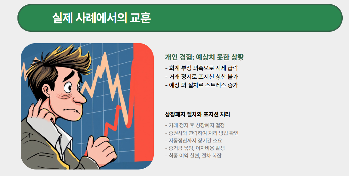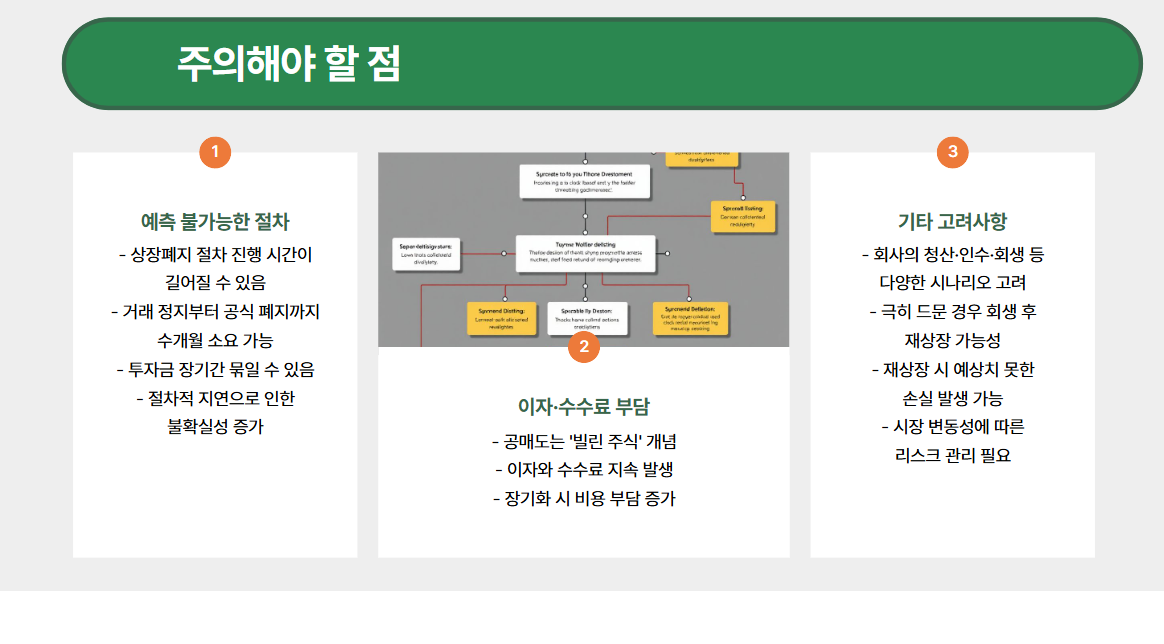 상장폐지 절차가 진행되면 거래 정지부터 공식 폐지까지 시간이 오래 걸릴 수 있습니다. 그 사이 투자금이 묶일 수 있음을 감안해야 합니다. - 이자·수수료 부담