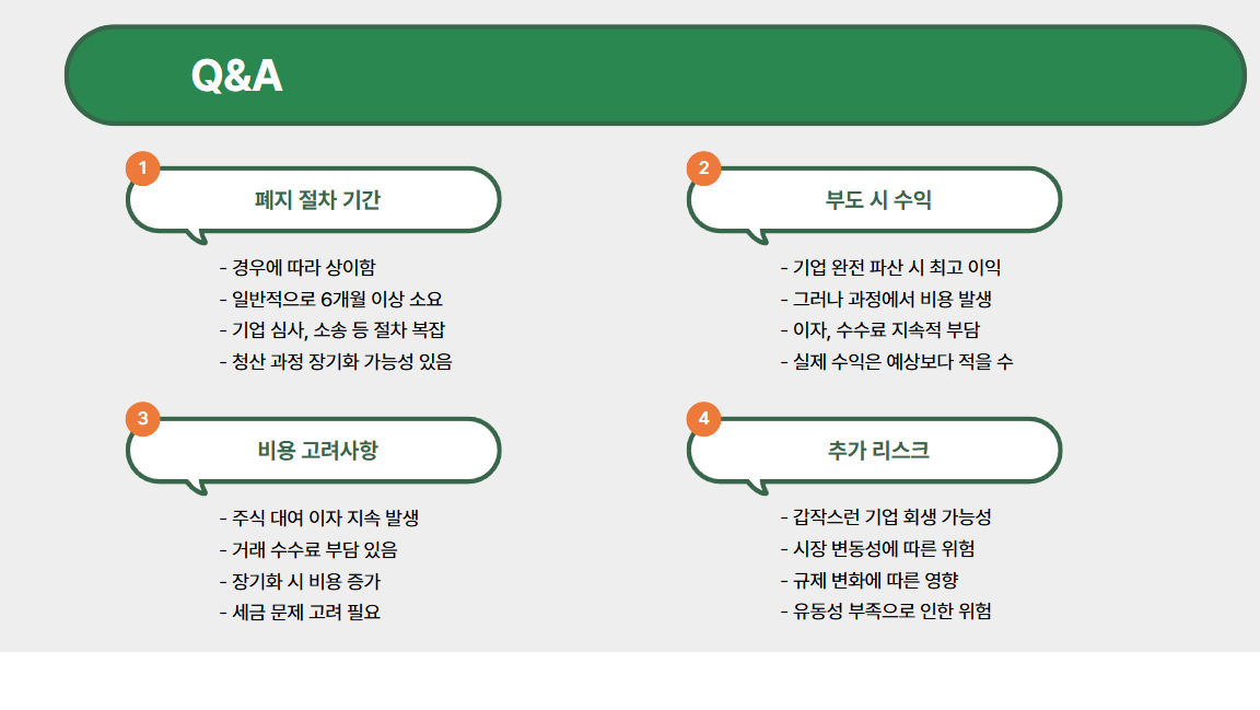 A. 기업이 완전히 파산해서 종잇조각이 된다면, 공매도 포지션은 사실상 최고 이익 구간이지만, 그 사이에 발생하는 비용과 변수가 많으니 방심은 금물입니다.
