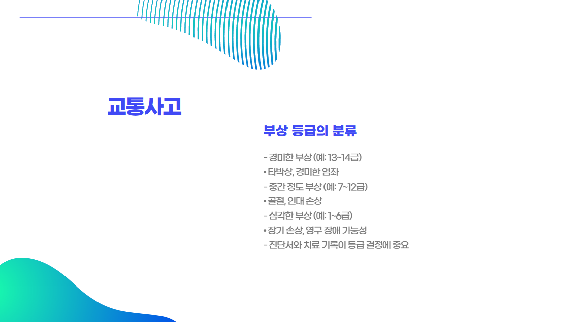 사고가 발생하면 인체 피해 정도에 따라 등급이 매겨집니다. 이 분류가 곧 배상금의 기준이 되기 때문에, 사고 당사자는 자신의 상해 수준을 정확히 파악해야 합니다. 만약 이를 소홀히 하거나 잘못된 정보를 전달받으면, 향후 합의 과정에서 불이익을 당할 수도 있죠.