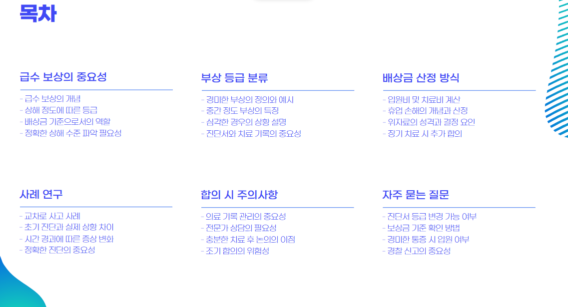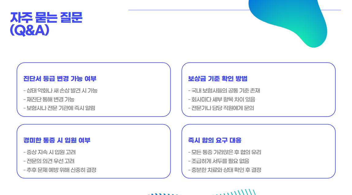 2) 전문가 상담: 법률적·의학적 지식이 부족하면, 합의 단계에서 혼란이 생기기 쉽습니다. 필요하다면 전문 업체나 변호사, 손해사정인의 도움을 받아보는 것도 방법입니다.