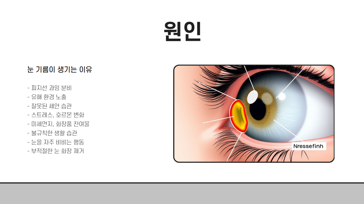 우리의 눈꺼풀에는 피지를 분비하는 선이 있어, 일정 정도의 기름은 자연스러운 현상입니다. 하지만 과로, 스트레스, 호르몬 변화 등으로 과도하게 분비될 경우 번들거리는 눈가가 되기 쉽습니다. - 유해 환경 노출