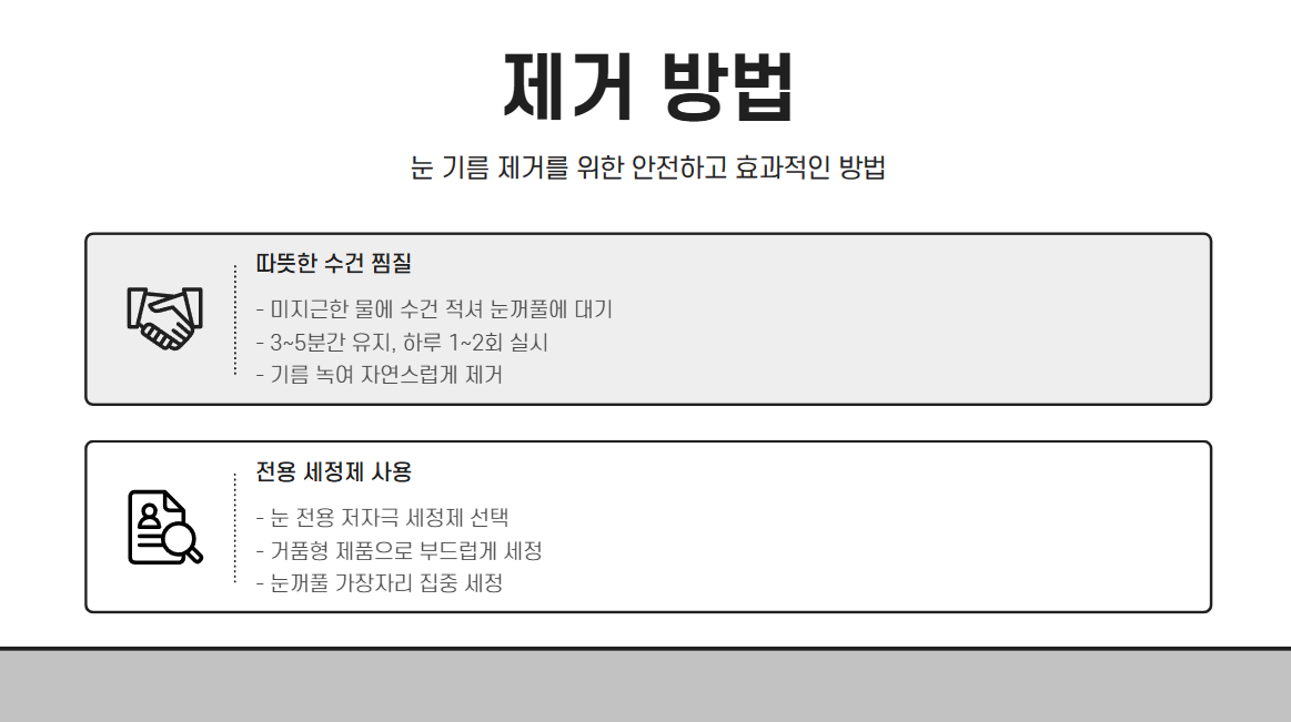 눈 전용 클렌저나 거품형 세정을 활용하면 기름을 말끔히 씻어낼 수 있습니다. 너무 강한 제품 대신, 눈가 전용 저자극 세안제를 선택하는 게 안전합니다. - 면봉이나 화장솜 활용