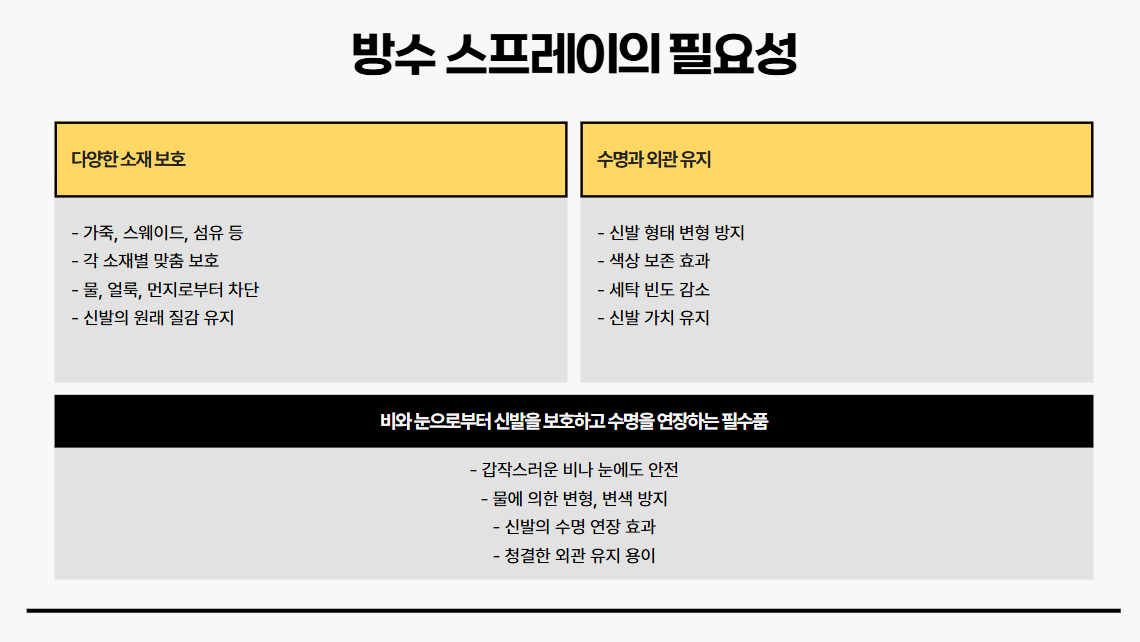 사실 예쁜 신발을 사고도 비나 눈에 흠뻑 젖어 망가지는 일이 빈번합니다. 가죽 소재는 물에 약하고, 스웨이드나 누벅 같은 재질은 조금만 습기에 닿아도 색이 번지거나 보풀이 일어나기 쉽죠. 이럴 때 방수 스프레이를 뿌려주면 표면에 막이 형성되어 물과 먼지 침투를 막아줍니다. 그래서 외출할 때 날씨가 궂더라도 신발을 안심하고 신을 수 있죠.
