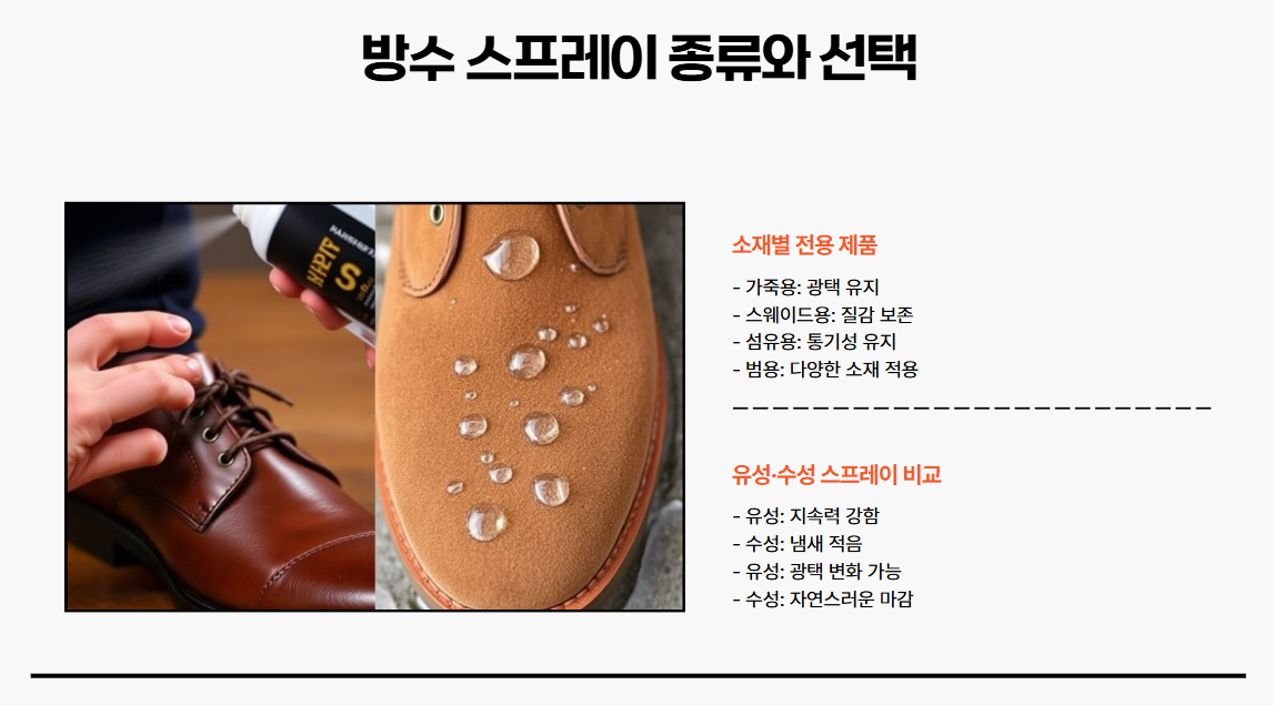 가죽, 합성피혁, 스웨이드, 섬유 등 다양한 소재가 존재하므로, 자신의 신발 재질에 맞는 전용 스프레이를 선택하는 것이 가장 중요합니다. 잘못된 제품을 쓰면 얼룩이 생기거나 변색될 위험이 있습니다. - 유성·수성 스프레이
