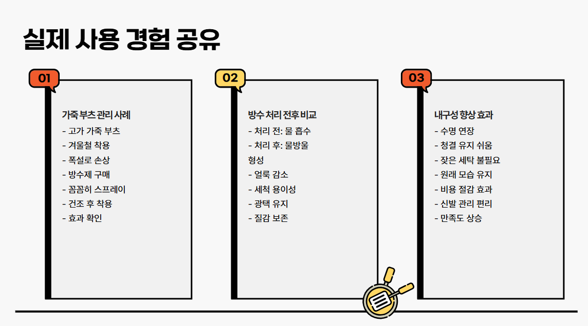 제가 한 번은 꽤 값비싼 가죽 부츠를 구입한 후, 겨울철 내내 그대로 착용했던 적이 있습니다. 처음엔 아무 문제 없었지만, 어느 날 폭설이 내려 길이 질퍽해지자 부츠 겉면이 상당히 손상되더군요. 그 경험 이후에 방수 제품을 찾기 시작했고, 각종 블로그와 커뮤니티에서 후기들을 꼼꼼히 살펴본 뒤 전용 스프레이를 하나 구입했습니다.