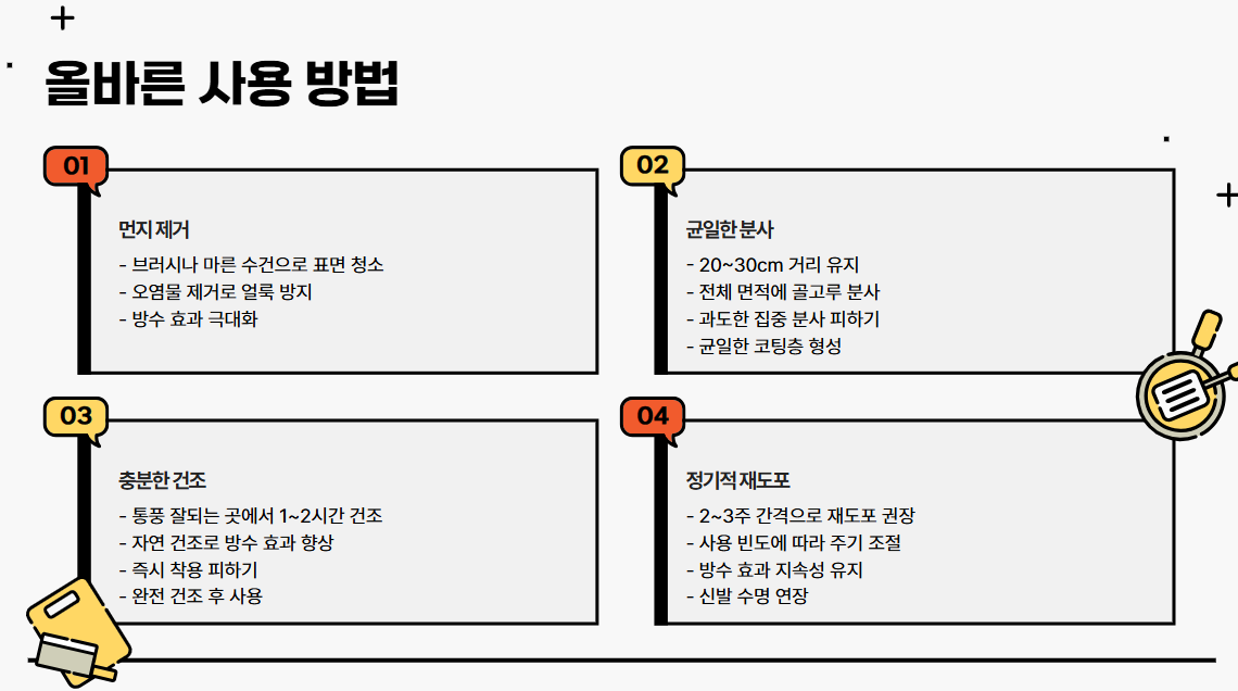 바른 뒤 즉시 외출하는 것보다는, 약간의 여유를 두고 자연 건조를 시켜주는 편이 좋습니다. 통풍이 잘되는 곳에서 1~2시간 말려주면 방수 효과가 한층 더 좋아집니다. - 재도포 주기