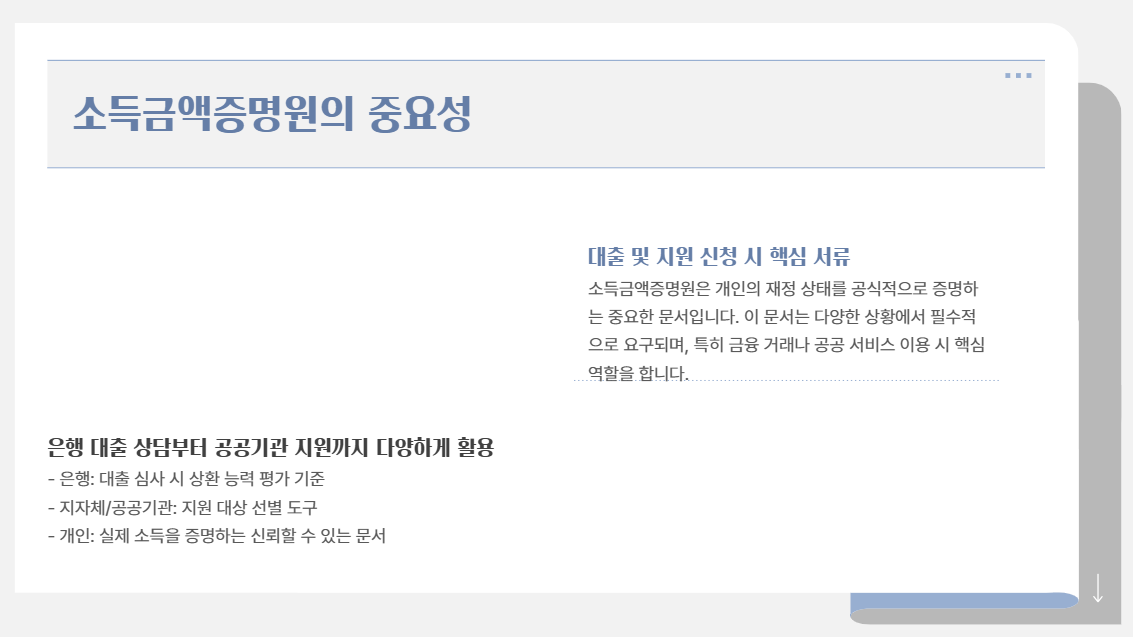 소득금액증명원은 한 해 신고된 종합소득을 항목별로 요약한 국세청 공식 문서다. 근로·사업·임대·금융이자 등 모든 소득이 합산돼 “내 실제 소득”을 보여 준다. 은행은 이를 기준으로 상환 능력을 파악하고, 지자체나 공공기관은 지원 대상 여부를 걸러낸다. 준비가 늦어지면 대출 한도나 서류 마감일을 놓칠 수 있어, 평소 절차를 익혀 두는 편이 안전하다.