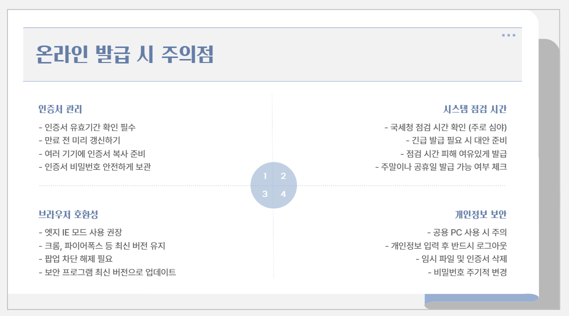 | 온라인 발급 시 인증서가 꼭 필요할까? | 홈택스·손택스는 인증서 필수지만, 무인 발급기나 세무서 창구는 신분증만 있으면 된다. |