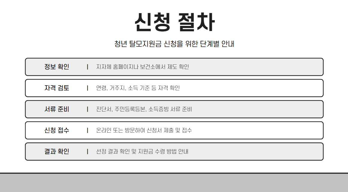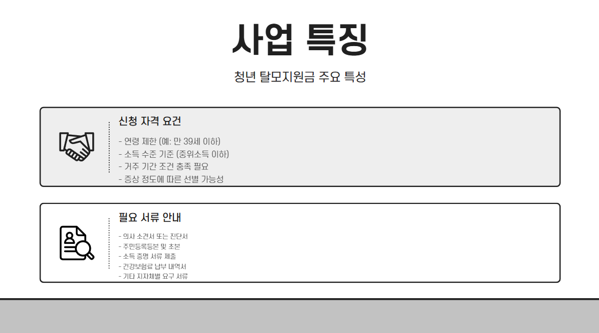 대부분 나이 제한과 함께 소득 수준(중위소득 100% 이하 등)을 충족해야 합니다. - 필요 서류