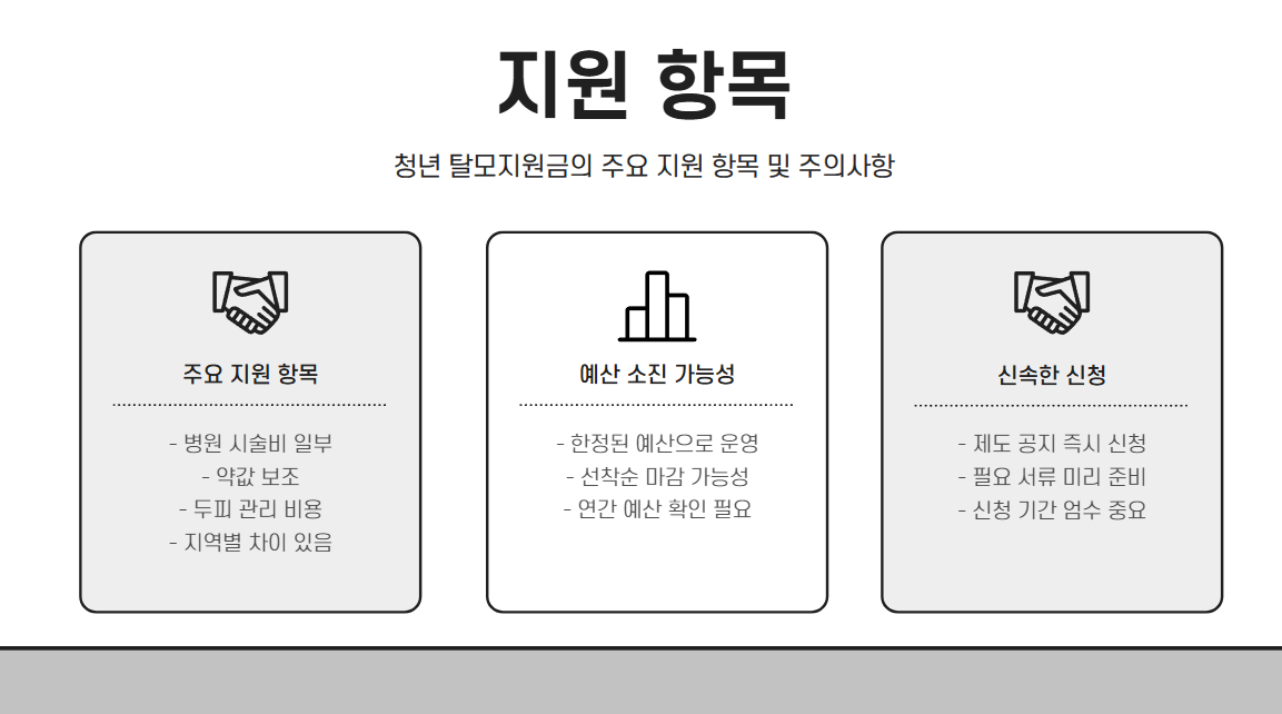 병원 시술비 일부, 약값 보조, 두피 관리 비용 등을 지원해주는 경우가 많습니다. 단, 각 지역마다 차이가 큼. - 예산 소진 주의