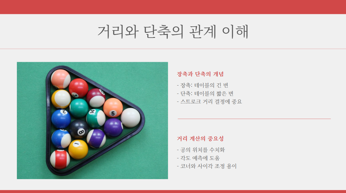- 단축(짧은 변): 공을 살짝 굴려 쿠션을 이용할 때 핵심적인 역할을 담당합니다.