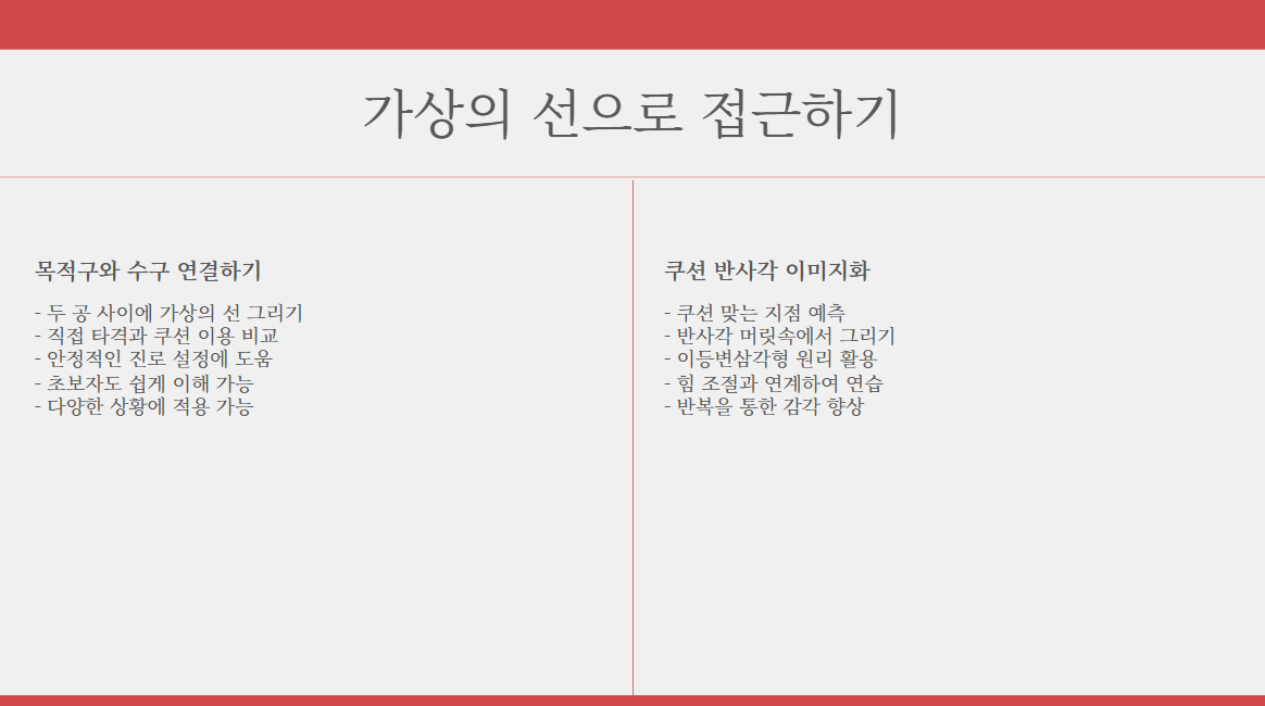 가령 수구가 왼쪽 코너에 있고, 목적구가 오른쪽에 있다면, 단순히 대각선으로 치는 것보다 쿠션을 한 번 이용해 더 안정적인 진로를 만드는 방법이 있을 수 있습니다. 이때 테이블 위에 선이 그려져 있다고 상상하고, 그 선을 따라 공의 이동 경로가 어떻게 꺾일지 계산하는 것이죠.
