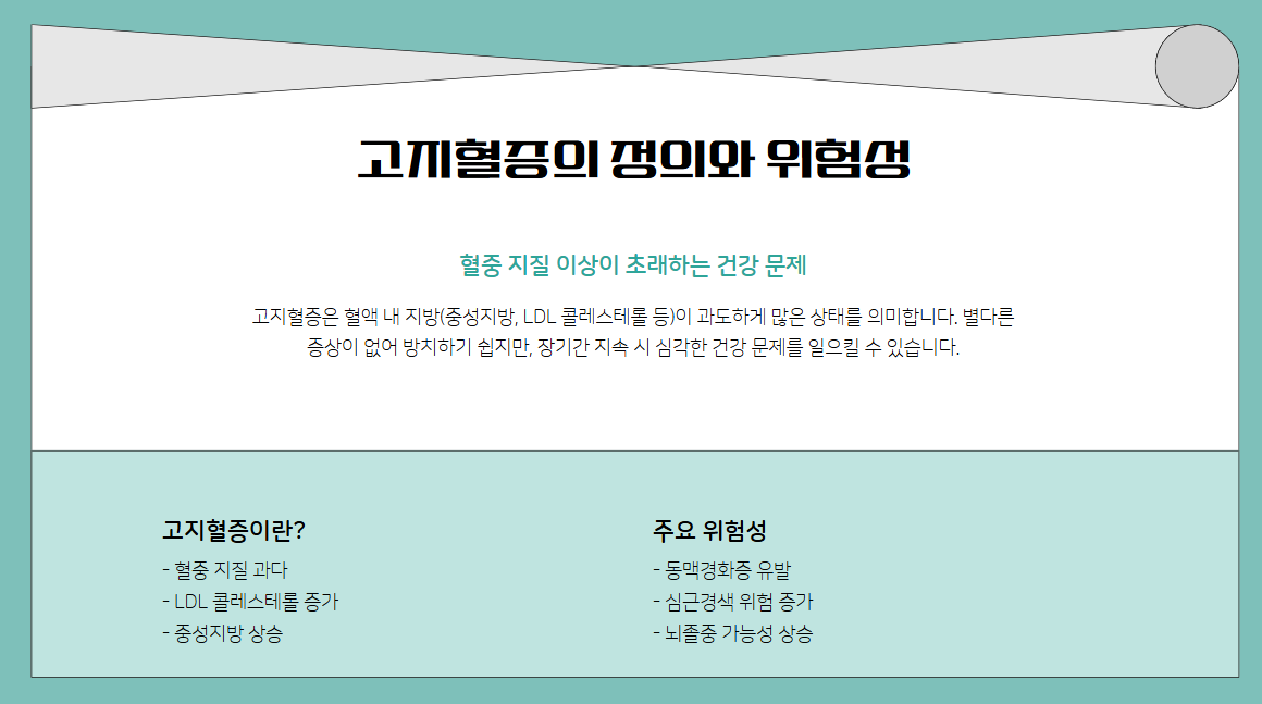 과도한 지방(중성지방, LDL 콜레스테롤 등)이 혈중에 많이 포함된 상태를 말합니다. 별다른 증상이 없는 경우가 많아 방치하기 쉽지만, 시간이 쌓이면 혈관 벽에 찌꺼기가 쌓여 심각한 문제를 일으킬 수 있습니다. 숨어있는 폭탄 같은 존재라서, 조기 관리가 중요하죠.