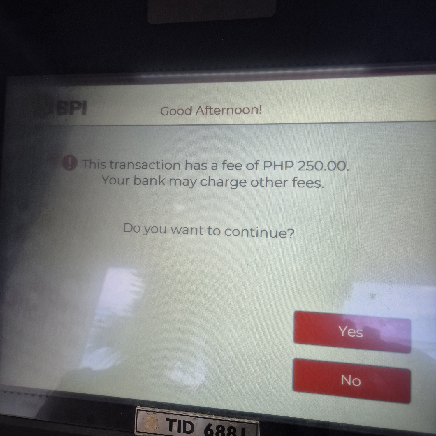 마지막으로 수수료 250페소가 지출되는데 출금 진행하겠냐고 물어보네요. [YES]