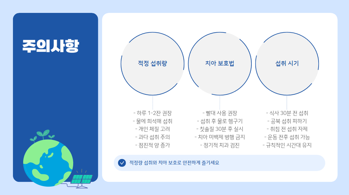 A. 하루에 1~2잔이 적당합니다. 너무 많이 마시면 치아 에나멜에 손상을 줄 수 있으니, 스트로우를 사용하거나 물로 희석해서 마시는 것이 좋아요.