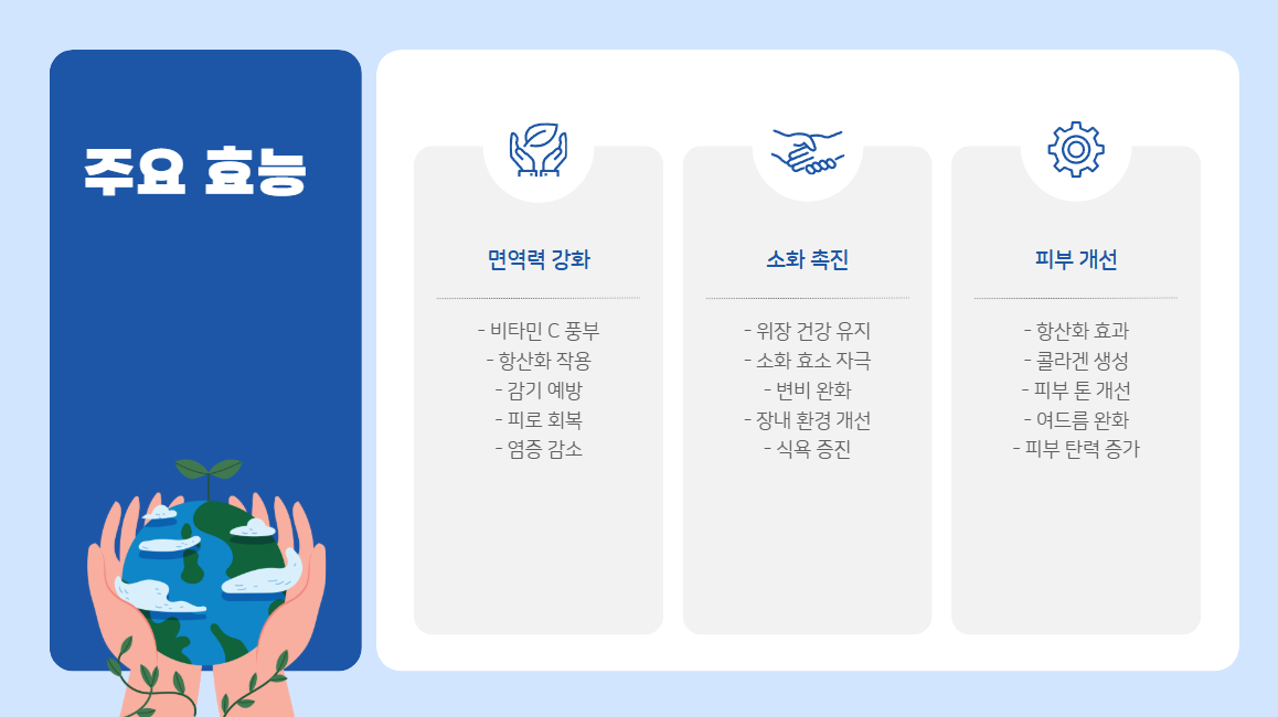 - 풍부한 영양소: 비타민 C와 항산화 물질이 가득해 면역력과 피부 건강에 좋습니다.